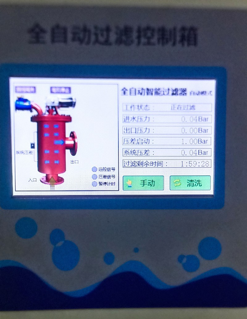 自動(dòng)控制:自動(dòng)控制有定時(shí)和壓差兩個(gè)方式。在過(guò)濾時(shí)間定時(shí)器上設(shè)定過(guò)濾時(shí)間,當(dāng)過(guò)濾時(shí)間到,啟動(dòng)排污,排污時(shí)間由排污時(shí)間定時(shí)器設(shè)定;同時(shí)控制系統(tǒng)實(shí)時(shí)將系統(tǒng)壓差與用戶(hù)設(shè)定的壓差相比較,當(dāng)系統(tǒng)壓差達(dá)到設(shè)定壓差時(shí),過(guò)濾器也進(jìn)行清洗排污,排污時(shí)間由排污時(shí)間定時(shí)器設(shè)定。排污時(shí)間到,停止清洗,系統(tǒng)恢復(fù)至其初始狀態(tài),為下一個(gè)過(guò)濾工序作好準(zhǔn)備。